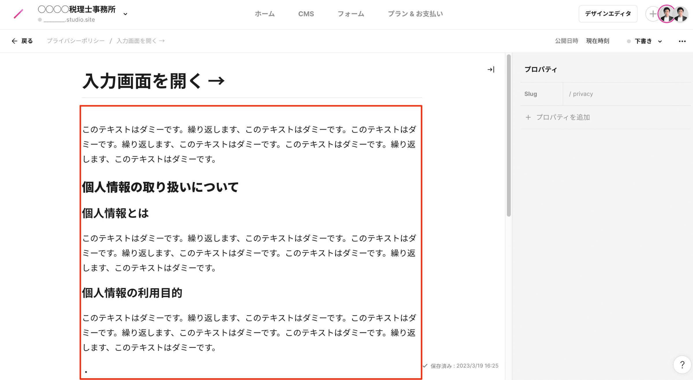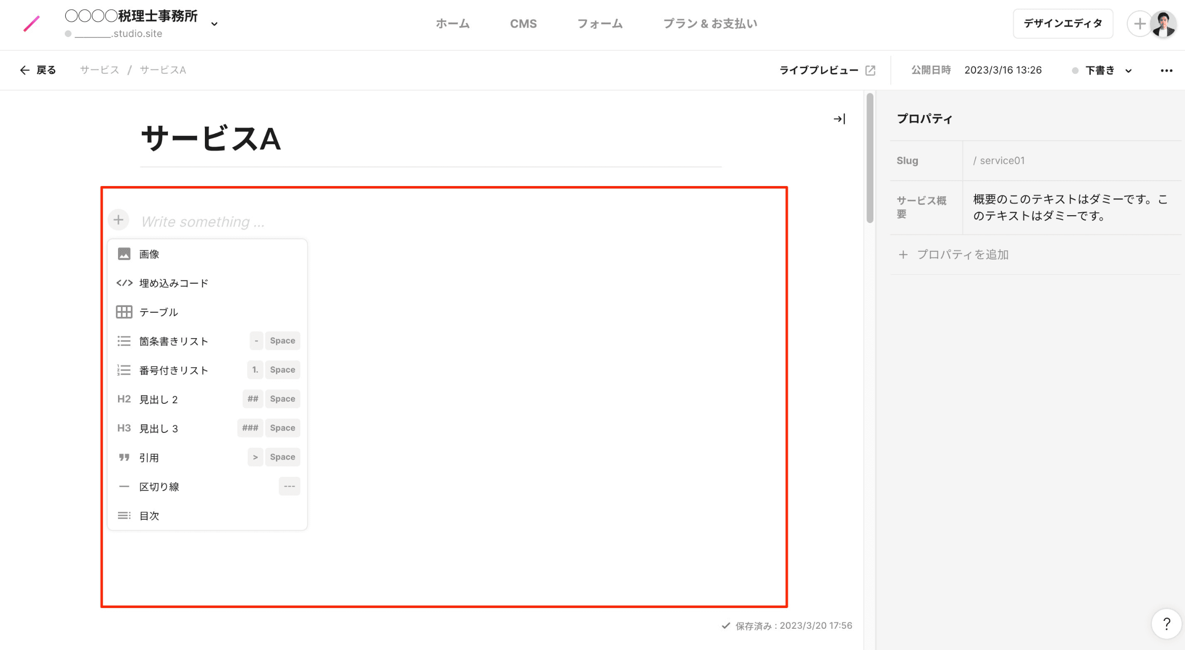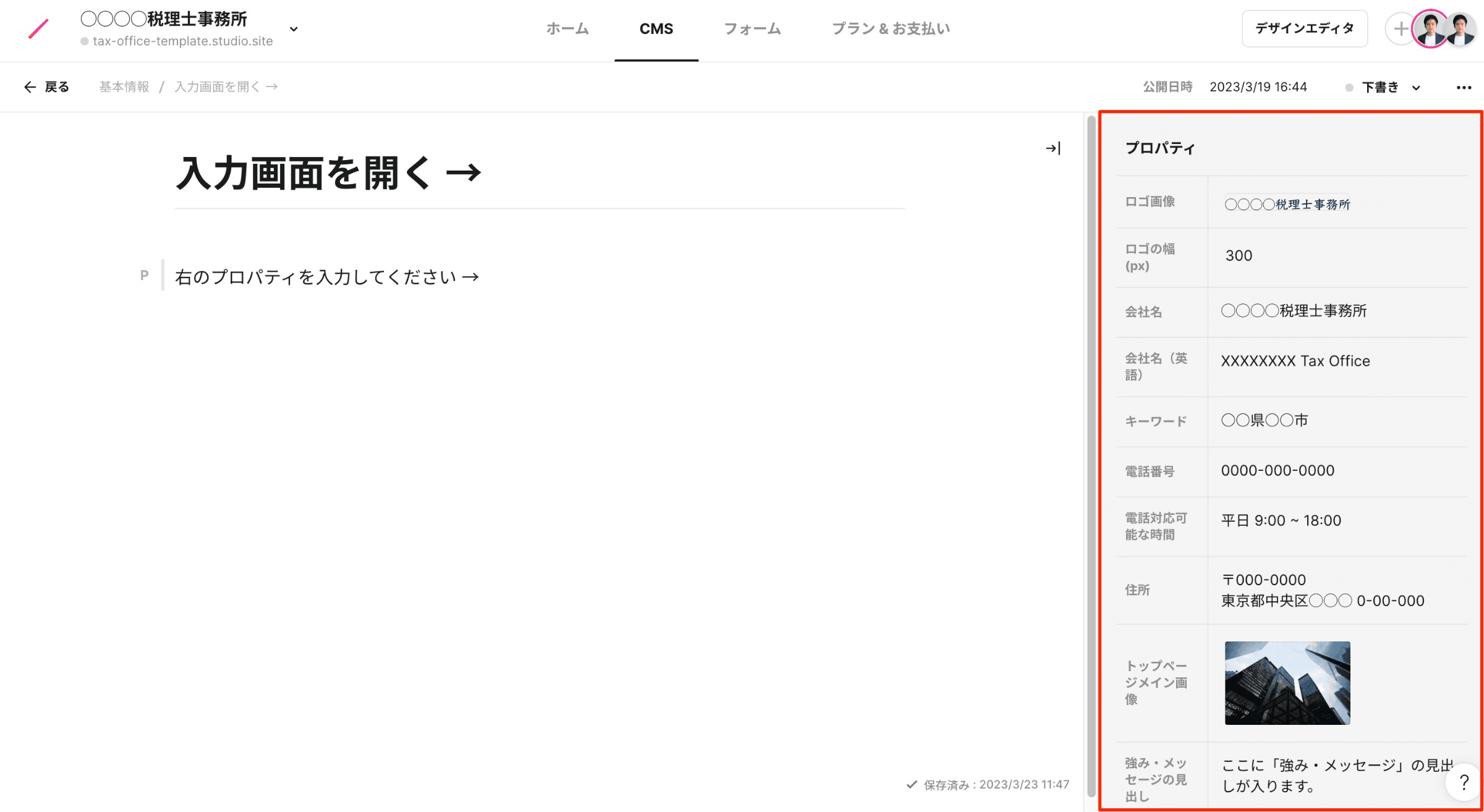 トップページのタイトルは、デフォルトでは、プロジェクト名(例:○○○○税理士事務所)が入ります。SEOの観点から、「○○○○税理士事務所|○○県○○市」などのように、キーワードを追加すると、よりよくなります。