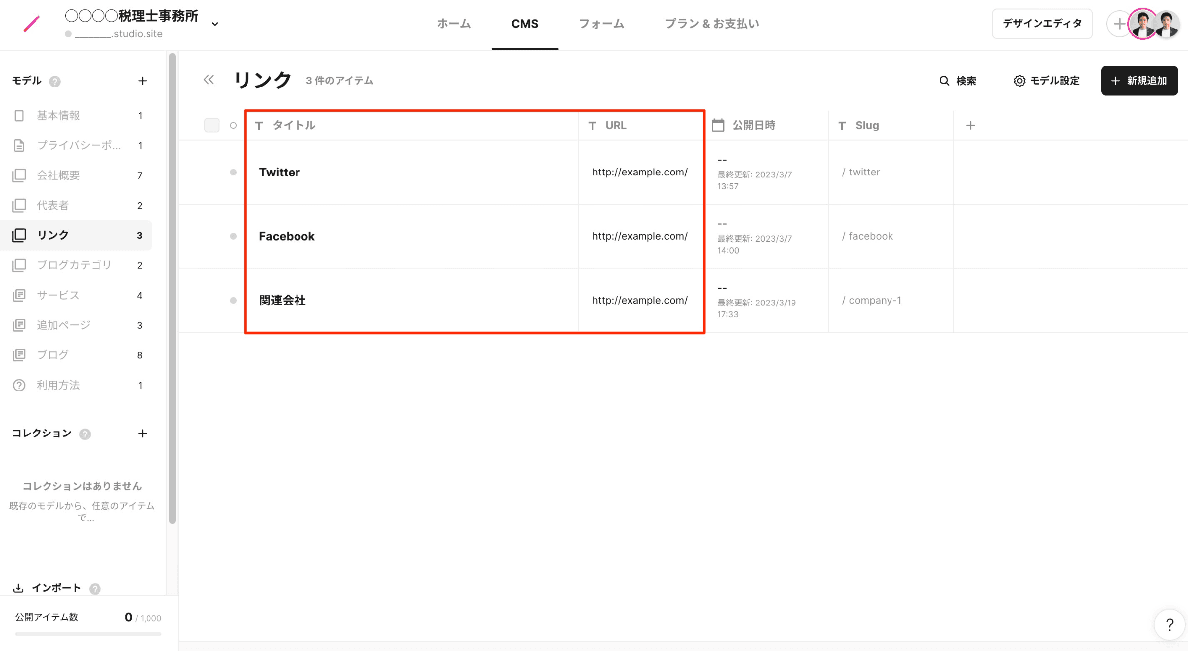 デフォルトでは、3つ分の行を用意していますが、右上の「新規追加」から追加することも可能です。また、タイトル左の□をチェックし、削除することも可能です。リンクを1つも表示したくない場合は、すべての行を削除してください。
