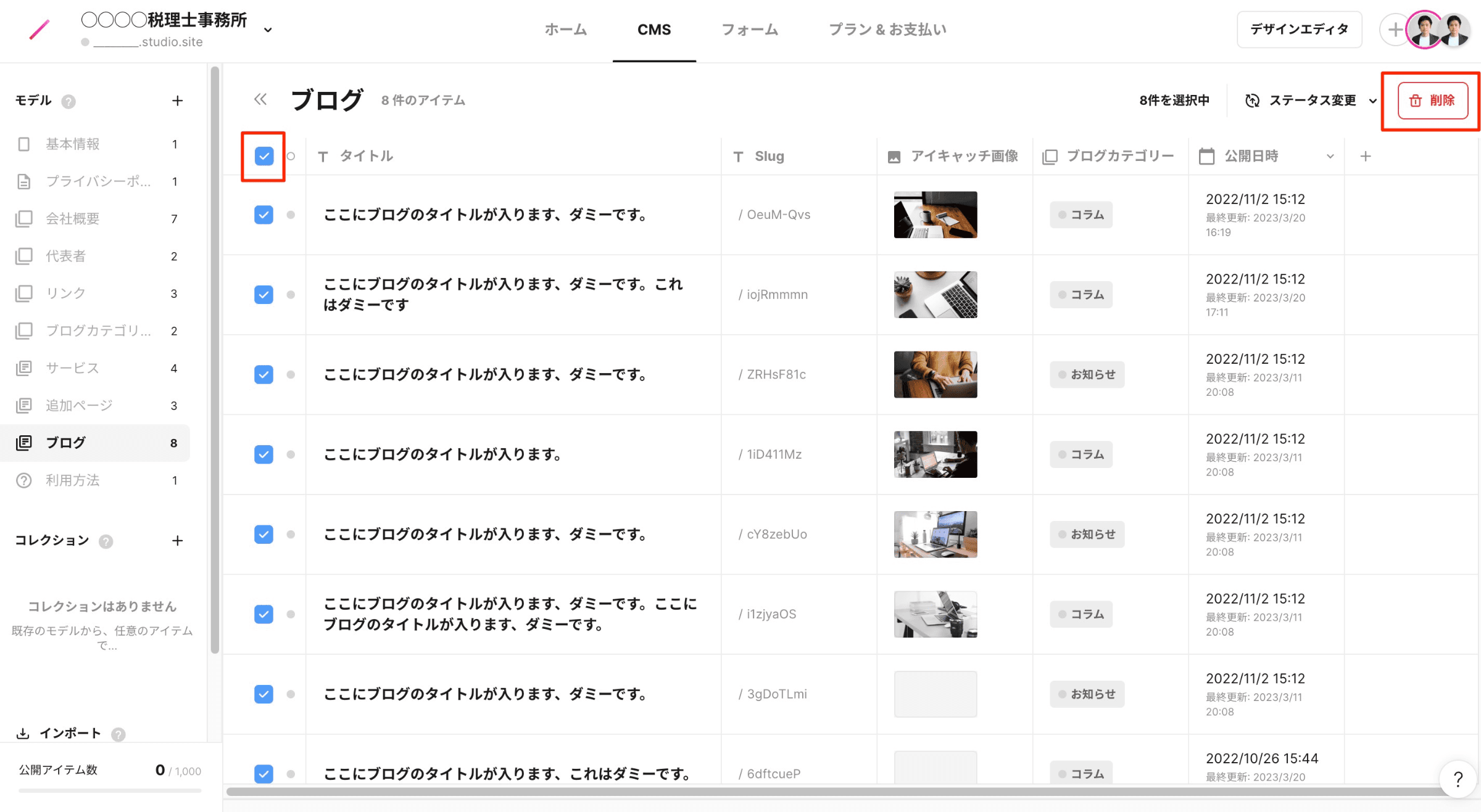 ブログカテゴリーの入力が完了したら、すべての行を選択し、「ステータス変更」から「公開する」をクリックしてください。