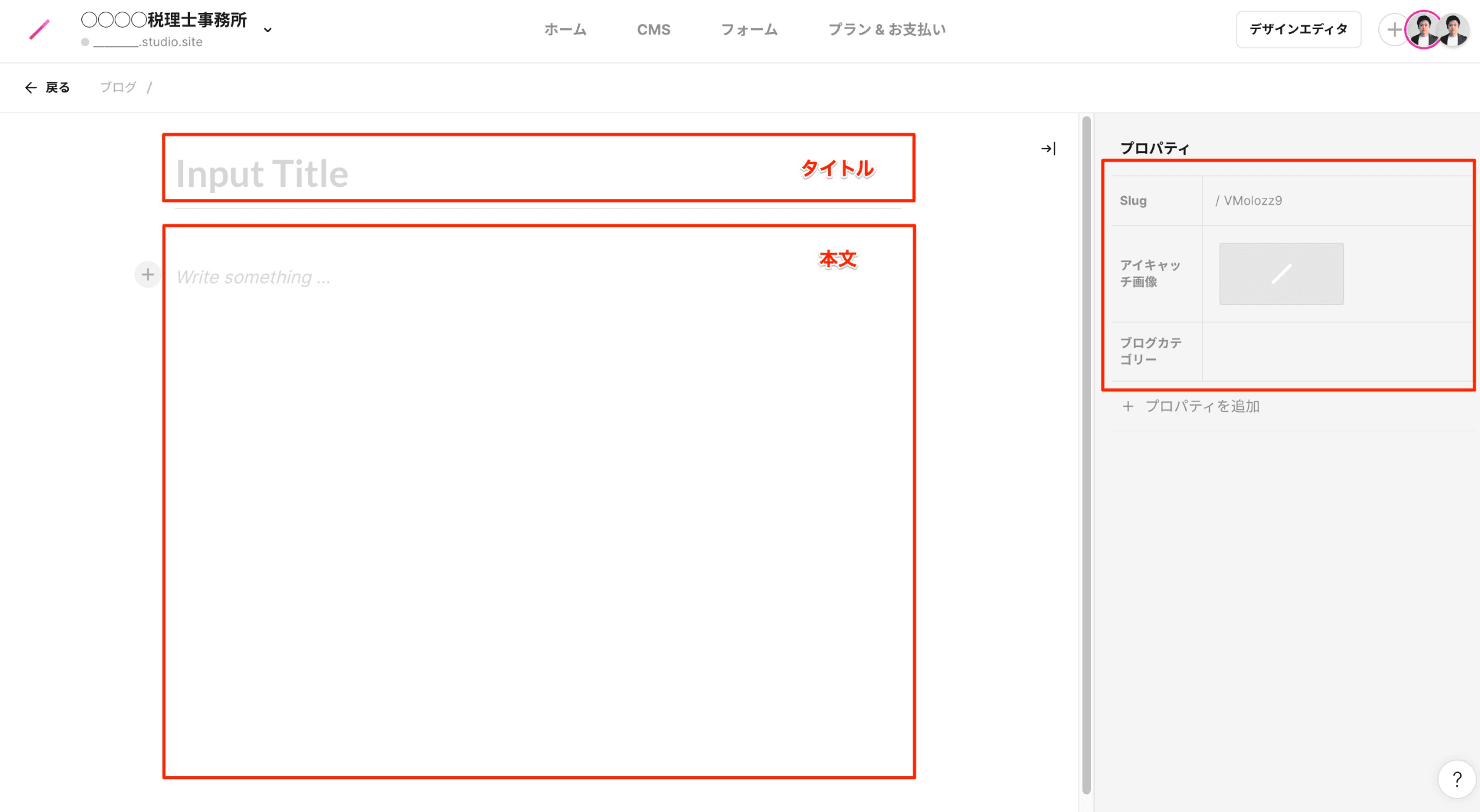 「新規追加」から上記画像のページを開き、ブログの「タイトル」「本文」を入力してください。また、プロパティの「Slug」を入力し、「アイキャッチ画像」をアップロードして、「ブログカテゴリー」を選択してください。「Slug」は、各ブログ記事ページのURLの末尾になりますので、半角英数および「-(半角ハイフン)」で任意の文字列を入力してください。