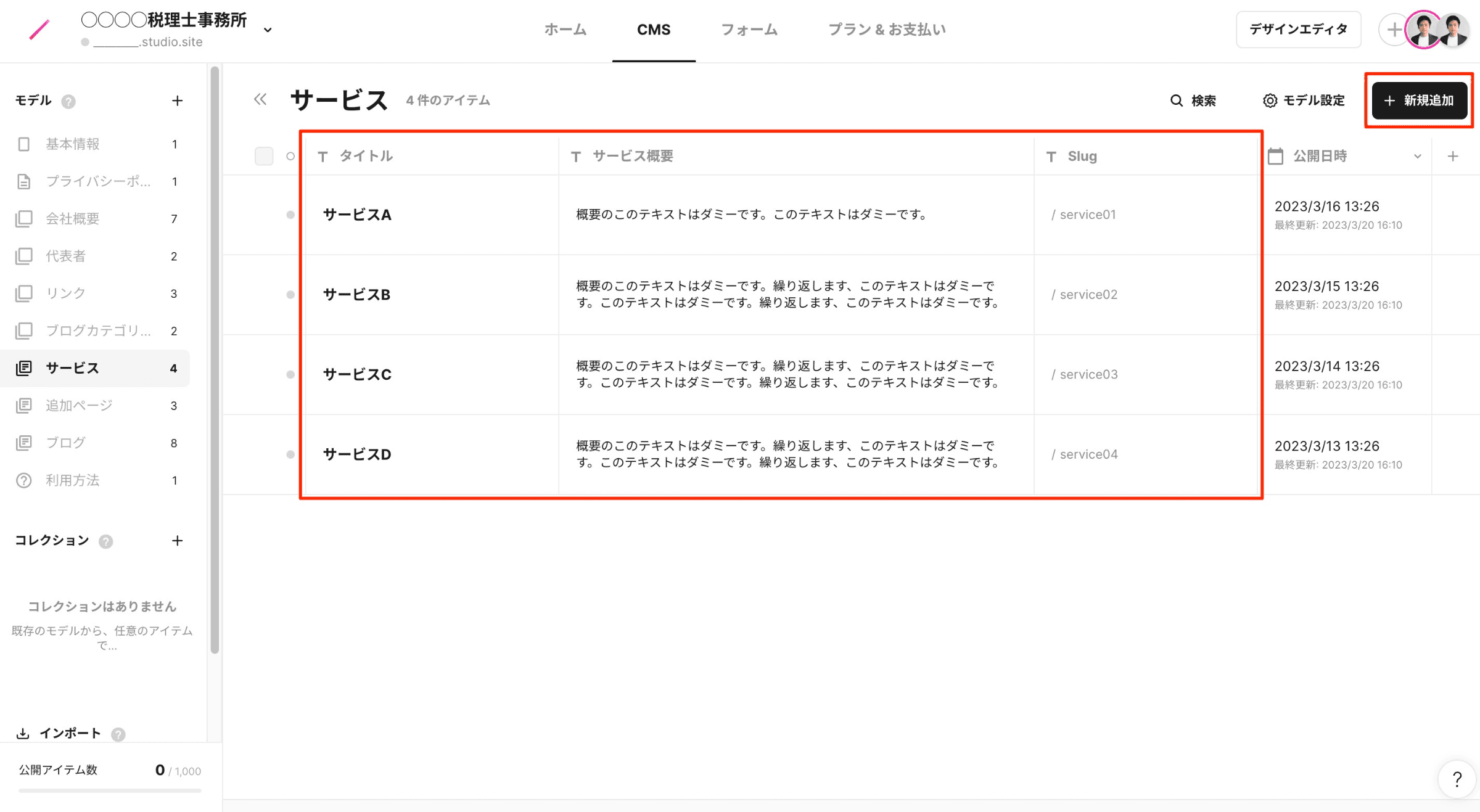 デフォルトでは、4つ分の行を用意していますが、右上の「新規追加」から追加することも可能です。また、タイトル左の□をチェックし、削除することも可能です。ただし、少なくとも1つはサービスを設定する必要があります。