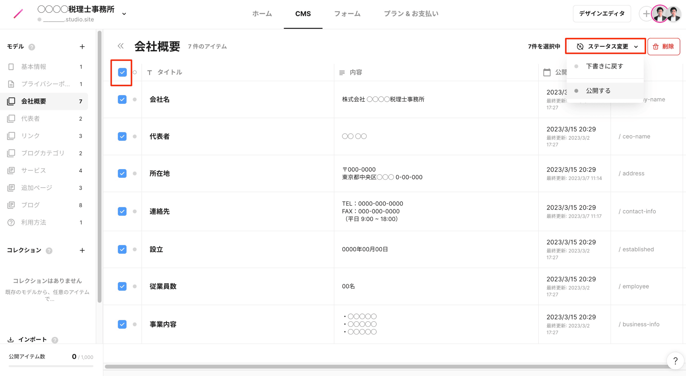 各項目の入力が完了したら、すべての項目を選択し、「ステータス変更」から「公開する」をクリックしてください。