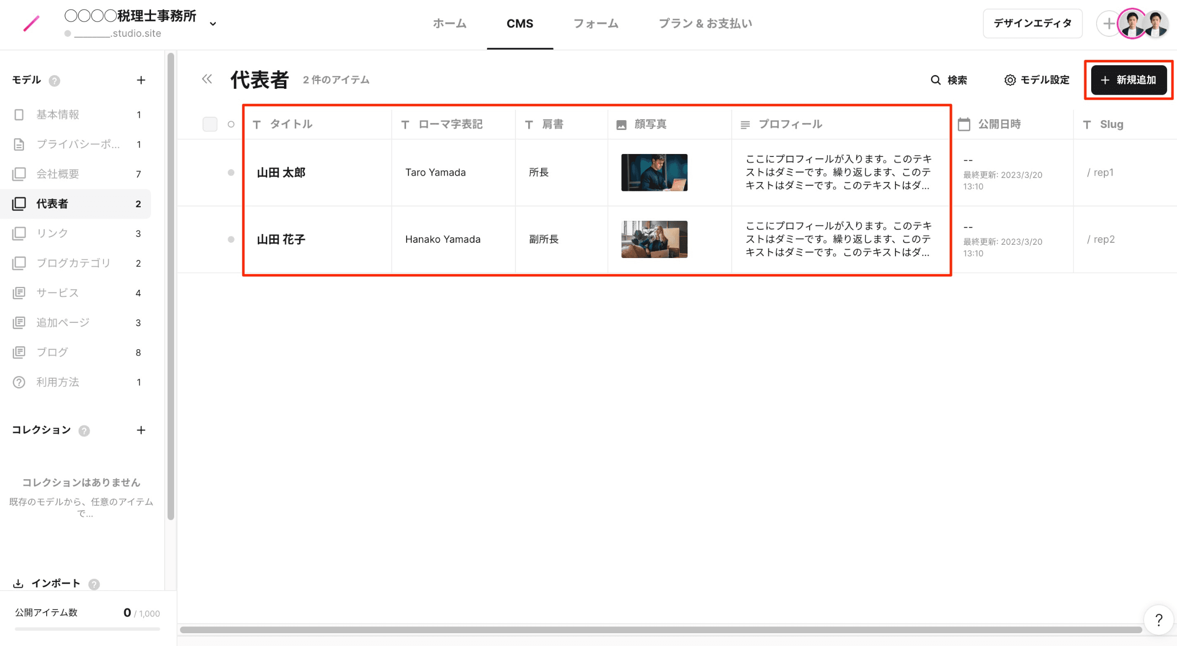 Webサイトに表示したい代表者の「タイトル(名前)」「ローマ字表記」「肩書」「プロフィール」を入力し、顔写真をアップロードしてください。「Slug」は変更不要です。