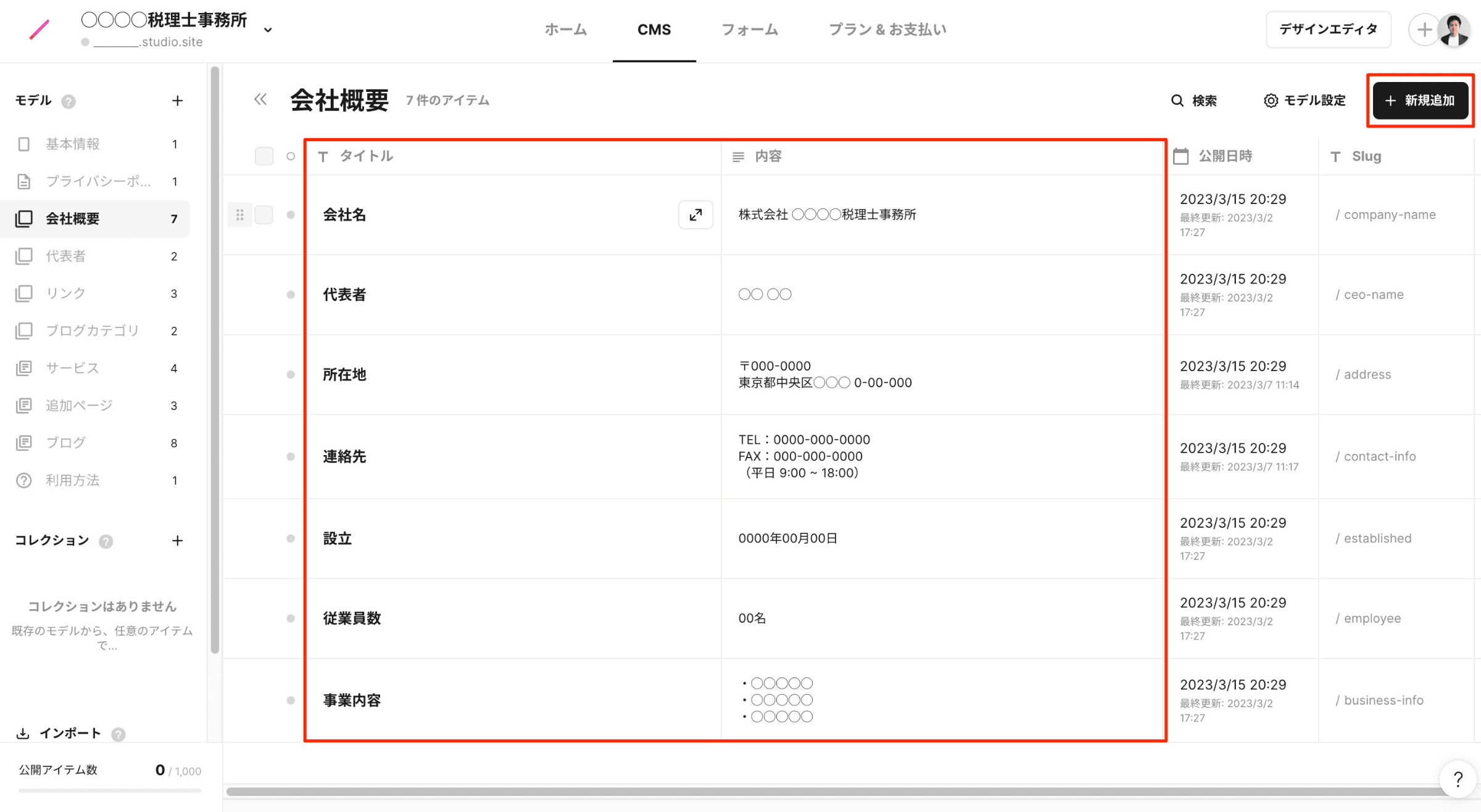 デフォルトでは、一般的な会社概要項目を設定していますが、右上の「新規追加」から項目を増やすことも可能です。また、不要な項目は、その項目のタイトル左の□をチェックし、削除することも可能です。