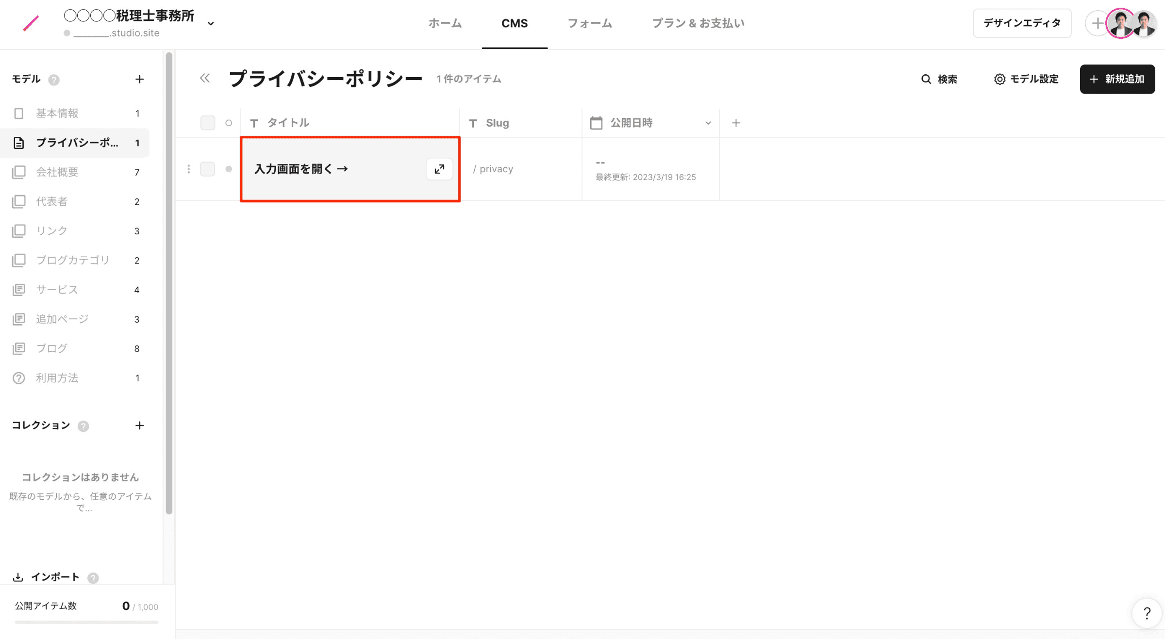 プライバシーポリシーのタイトル欄にマウスを移動すると、上図赤枠内のボタンが表示されますので、クリックして入力画面を開いてください。(※「新規追加」ボタンは押さないでください)