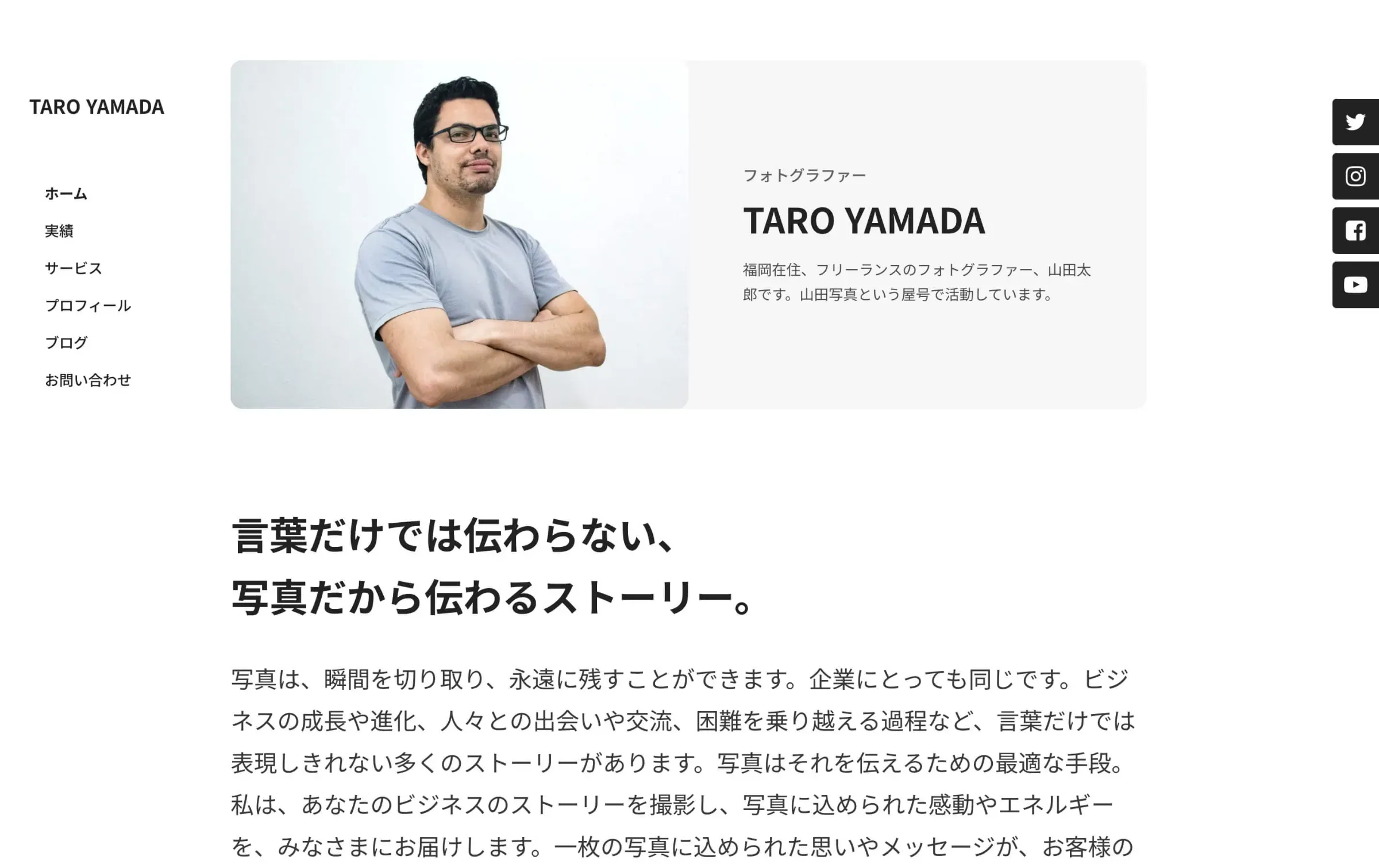 シンプルで汎用的なデザインのため、フォトグラファーやデザイナーなどのクリエイティブ職だけでなく、さまざまな業種の個人事業サイトとしてご利用いただけます。